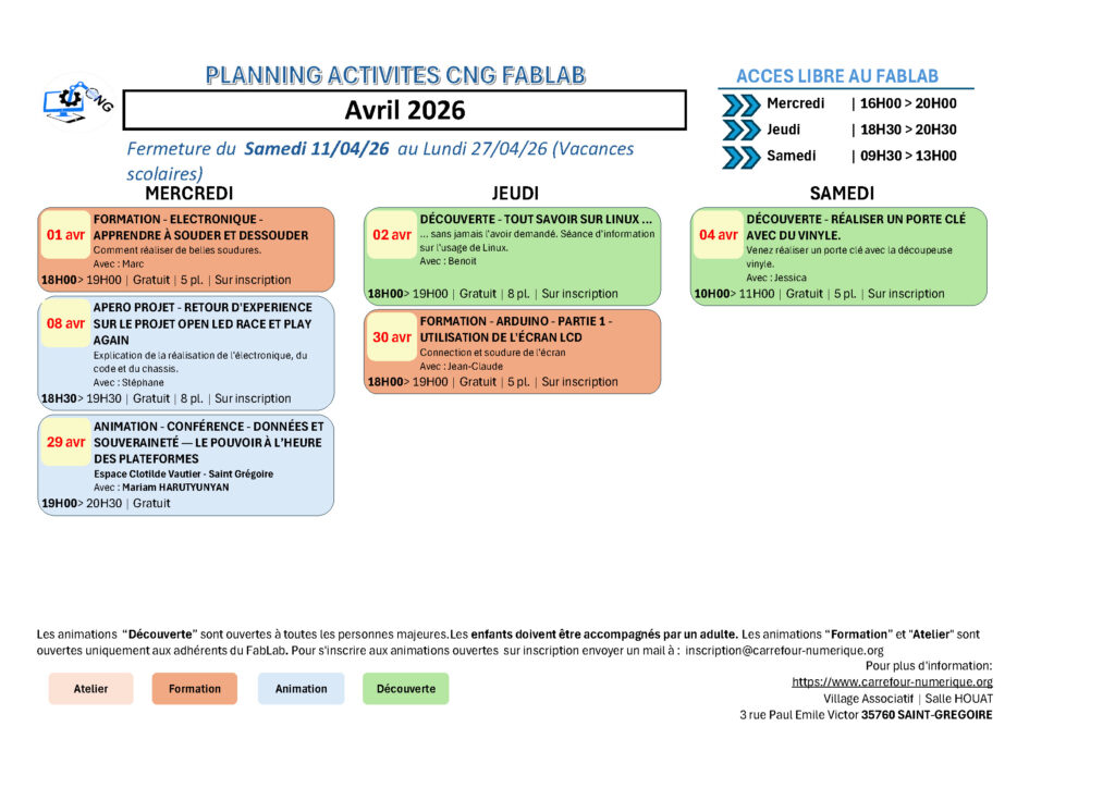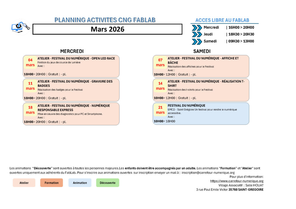 • Planning des activités du Fablab